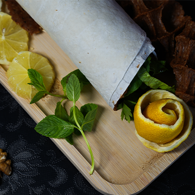 Çiğköfte 100gr, marul, nar ekşi, acı sos, limon, turşu, domates, mısır, maydonoz